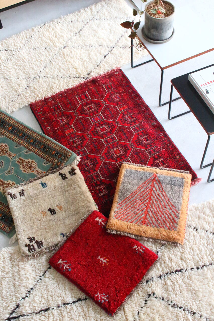 ラグは単に数を集めるのではなく、当店のヴィンテージ家具に合わせたイメージをG.E.Mさんと共有しながらセレクトしています。